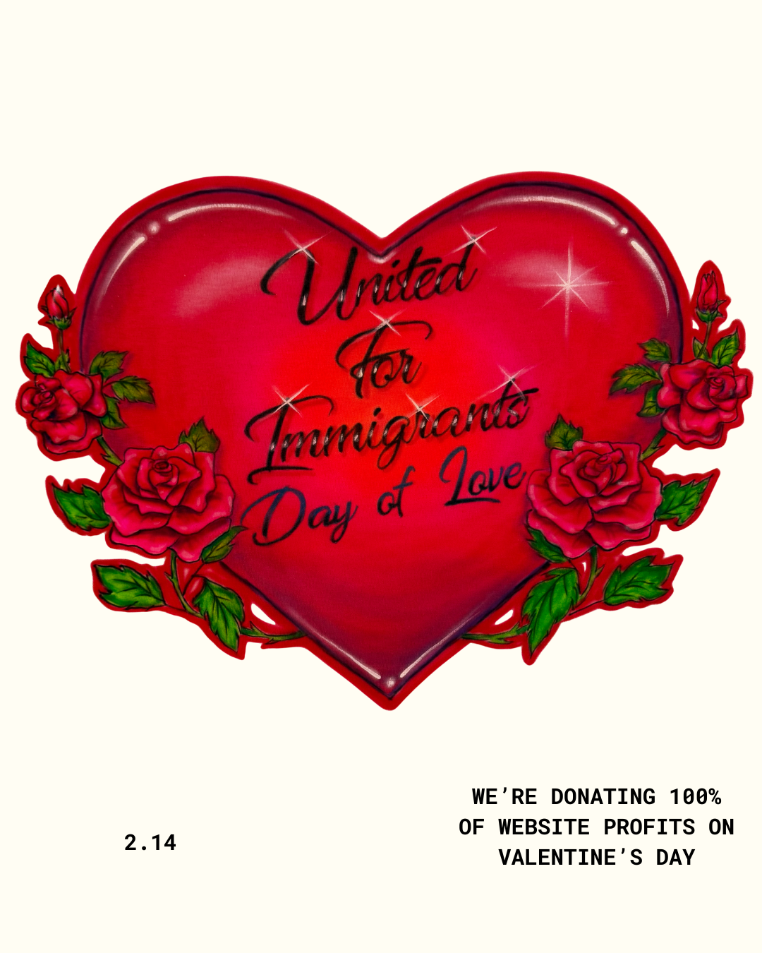 We are donating 100% of profits on Valentine's Day to support our immigrant community. United for Immigrants is about showing up for community, to let them know that they are valued and loved. We are standing with one another to support and uplift each other.